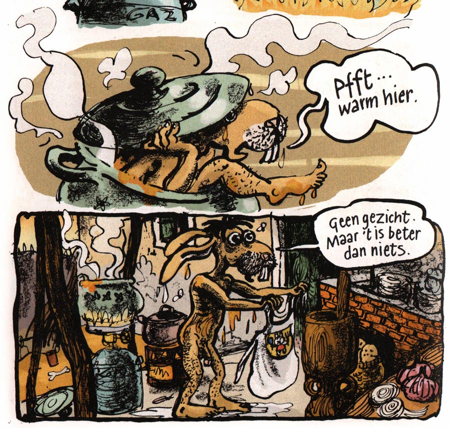When Janssen traveled to the Dutch city Haarlem to pick up his VSB award, he chatted with jury member Pieter van Oudheusden. Van Oudheusden was a novelist and translator who occasionally wrote scripts for comics. They decided to collaborate. Their first effort, 'Een Nachtegaal In De Stad' (Wonderland, 2000), follows four people on a hot summer night in the city. 'Klaarlichte Nacht' (Wonderland, 2001) is a collection of four erotic short stories. The duo won most acclaim with their trilogy about African folklore character Bakamé the hare. Bakamé is a trickster character comparable to similar animal tales in other continents. He inspired Joel Chandler Harris' 'Br'er Rabbit' in the United States (later made into a popular Disney character too). Van Oudheusden and Janssen also saw similarities with the Flemish medieval poem about Reynard the Fox. The authors took several pre-existing stories about Bakamé and molded them in the graphic novel 'Bakamé' (Oogachtend, 2003), where the sly rodent torments the mayor of the real-life Rwandan village of Buruseri.