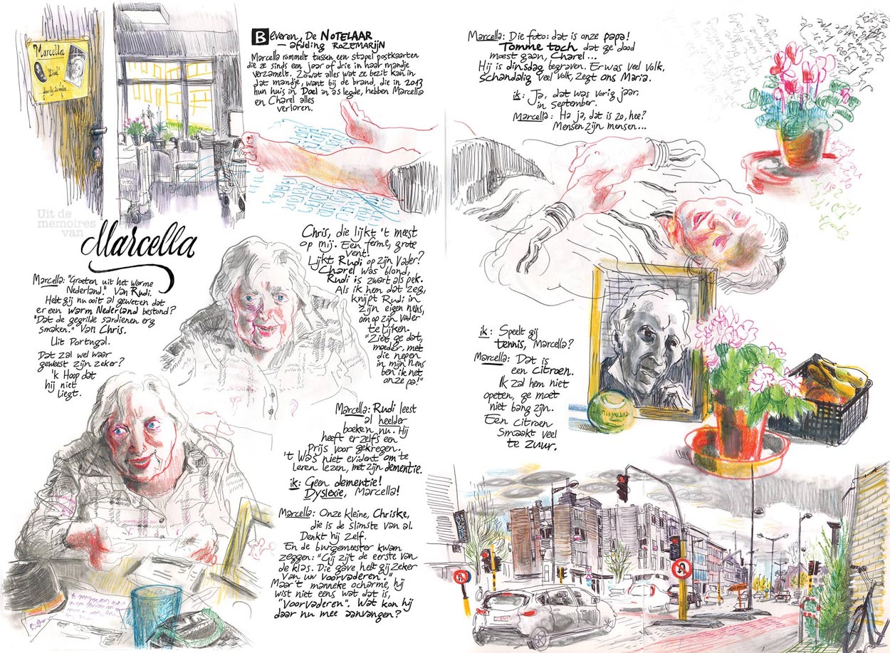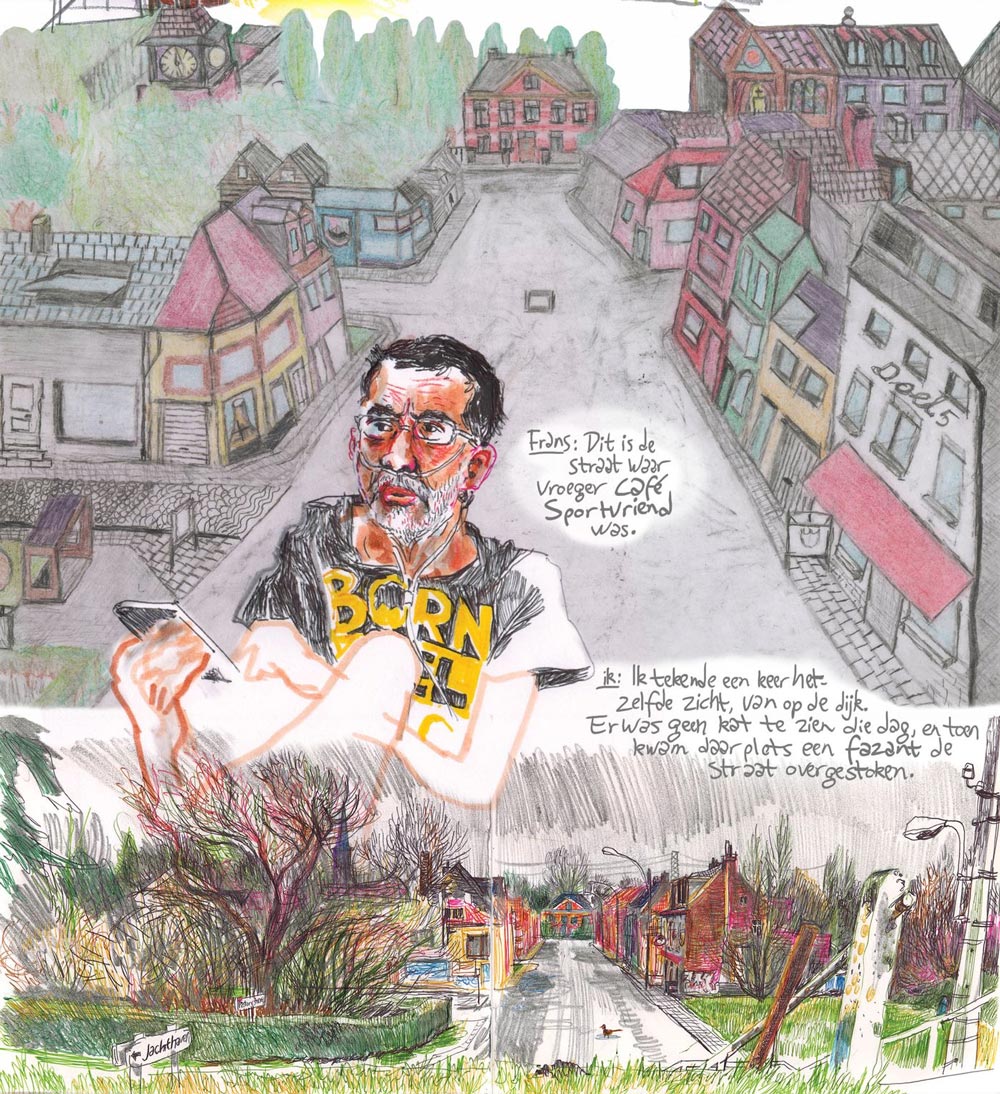 As a former refugee, Janssen could relate to the villagers of Doel. He often visited the place to make sketches, which he didn't redraw afterwards, so he could keep the atmosphere intact. At home, everything was scanned and cut-and-paste in new combinations. Starting off with a short comic published in the French magazine XXI, Janssen eventually made 'Doel' (Oogachtend, 2013). The book is a reflection of his conversations with local people. Sketches, some in black-and-white, others in color, are alternated with comics and written conversations. 'Doel' won praise by Flemish novelist and columnist Jeroen Olyslaegers and sold out in a few months. In 2018, Janssen created a new book about the topic: 'Er Wonen Nog Mensen - Tekenen Van Leven In Doel' (Oogachtend, 2018). He was inspired by the juridical decision to make Doel a living area again, which oddly enough had the opposite effect. The same people who'd fought to stay in the village for years suddenly moved out one by one. Janssen wanted to make his graphic novel about this paradox.