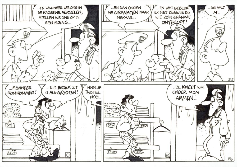 Together with scriptwriter Danny De Haes, Janssen then made the gag comic 'Komkommer en Kwel' (1994-1996), which ran in the gossip magazine Blik. The series starred two bumbling neighbors, one tall (Komkommer), the other short (Kwel). Their names are a pun on the expression for hopeless misery, "kommer en kwel", invented by Marten Toonder.