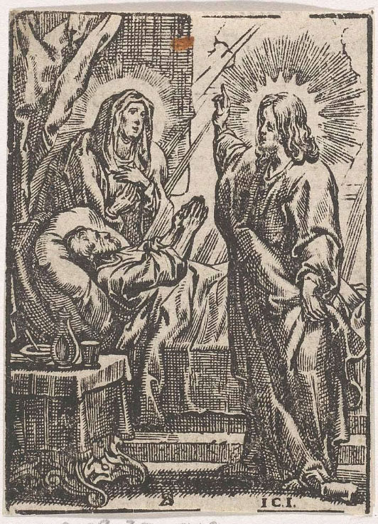 1849 print by Jan Christoffel Jegher of Jesus Christ healing a sick man with a gesture of blessing.
