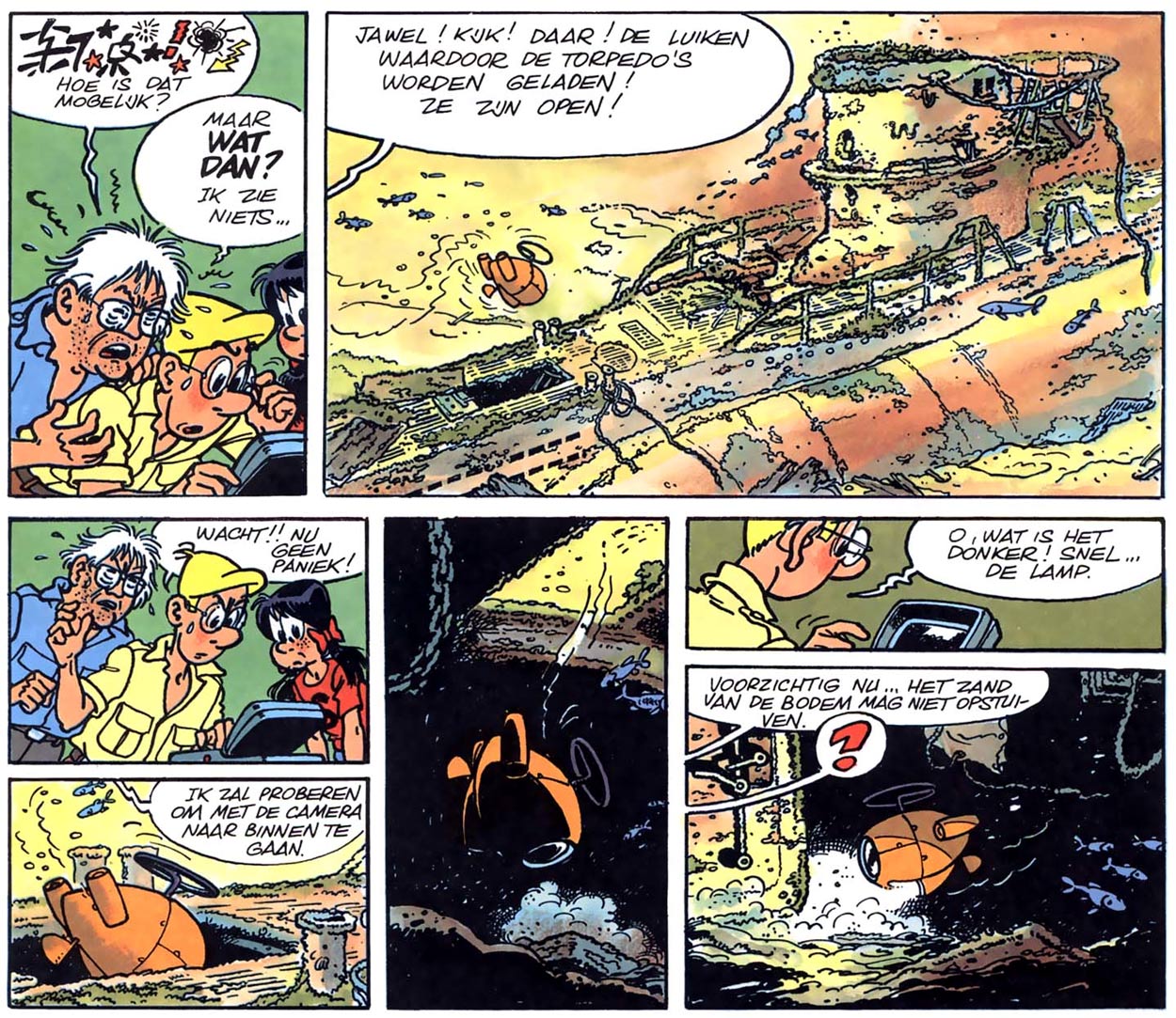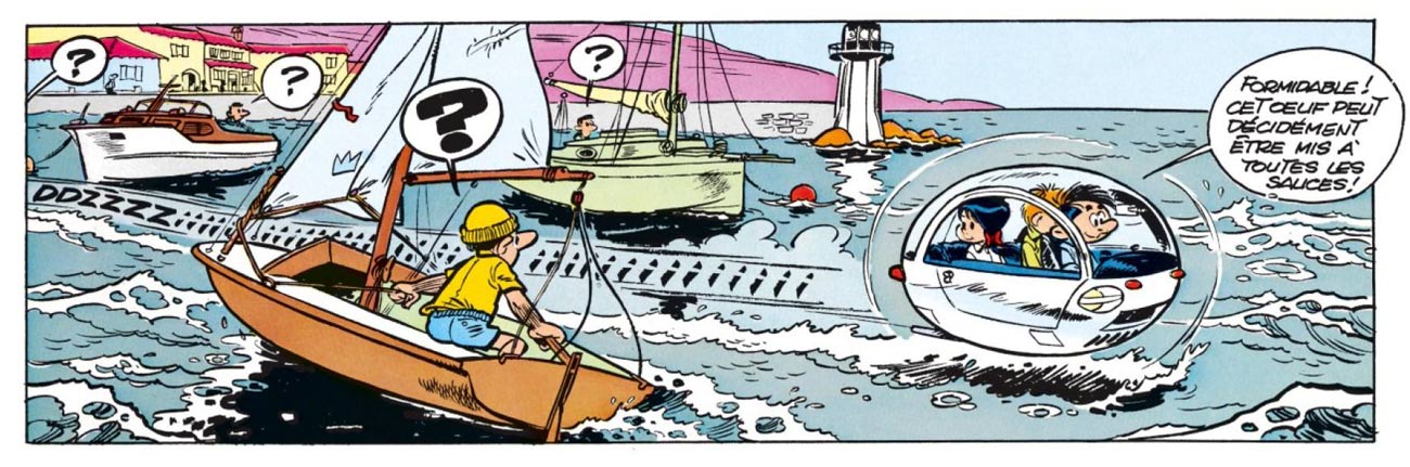 At Franquin's studio, Jidéhem also assisted on the backgrounds of Spirou's title comic, 'Spirou et Fantasio'. He participated in the stories 'La Foire aux Gangsters' (1958), 'Le Prisonnier du Bouddha' (1958-1959), 'La Peur au Bout du Fil' (1959) and most notably the Zorglub cycle ('Z comme Zorglub', 'L'Ombre du Z', 1959-1960). The latter two stories proved an example of Jidéhem's equal talent for drawing futuristic technology. In 1967, he also worked on the backgrounds of Franquin's swansong of the series, 'Panade à Champignac'. Together with Franquin, Denis and Roba, Jidéhem was part of the collective "Ley Kip" ("L'équipe", meaning "the team"), which produced the one-shot story 'L'Île au Boumptéryx' (1959), about birds laying exploding eggs. Jidéhem provided the background art.