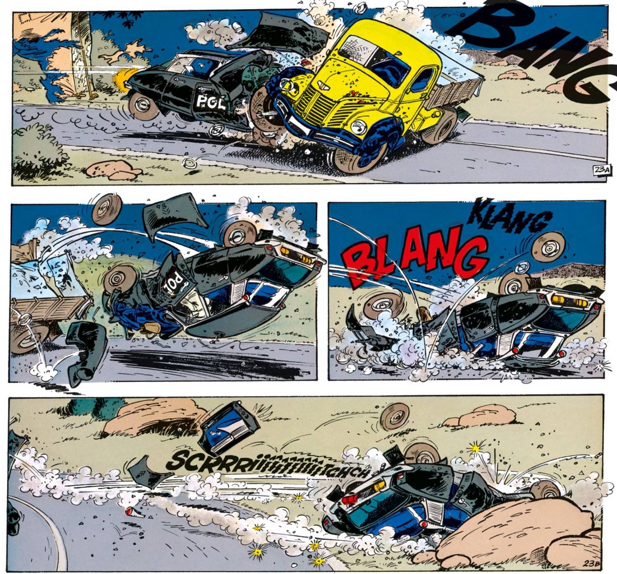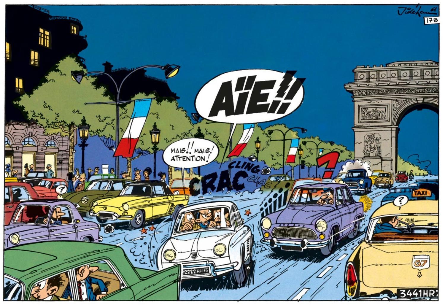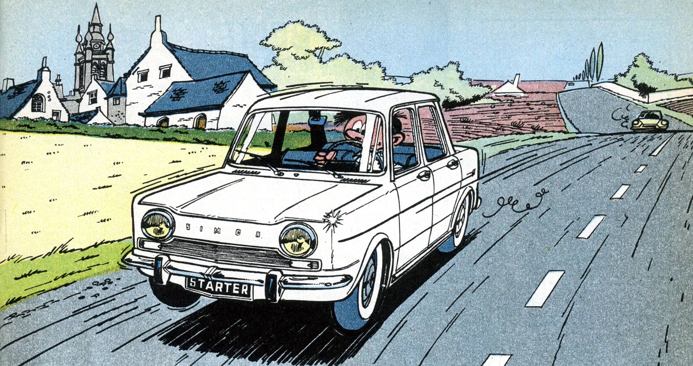 Throughout his career, Jidéhem also did a couple of commercial projects in addition to his regular series. In 1959, he was contracted by the magazine Auto-Journal to make drawings of car tests at the racing circuit of Montlhéry. The editors also asked him to illustrate reconstructions of accidents. The collaboration ended when the artist refused to draw a motorcyclist who was cut in half after a crash with a Citroën DS. However, he returned to Auto-Journal in the mid-1990s with new 'Starter' reviews.