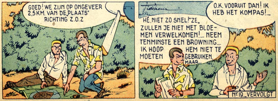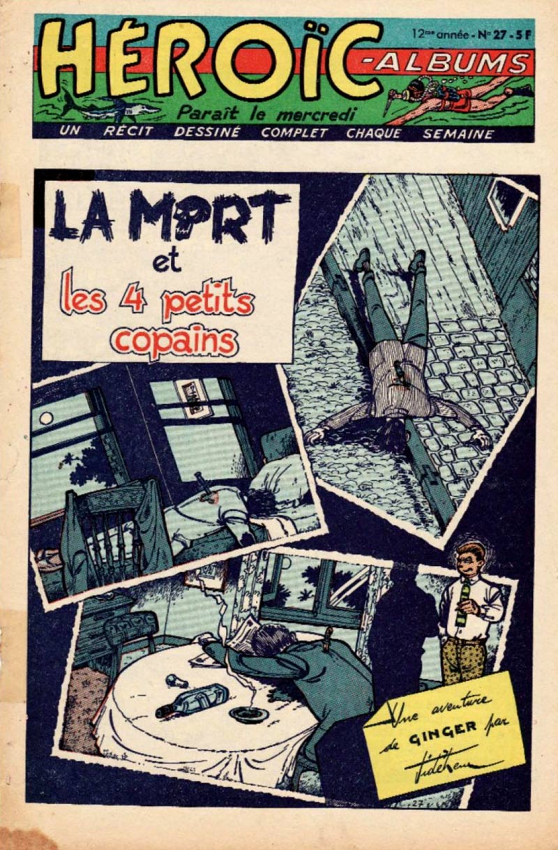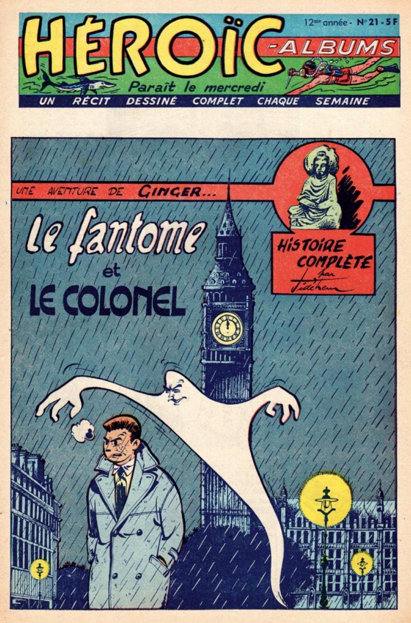 While still a student, he presented his work to Fernand Cheneval, the publisher of the weekly comic magazine Héroïc-Albums, a publication inspired by the adult tone of American comic books and the popular pulp serials of the time. It featured comics by artists such as Maurice Tillieux, Michel Greg, Albert Weinberg, Marcel Moniquet, François Craenhals, Fred Funcken, Christo, Fernand Dineur and Leika. De Mesmaeker was eighteen years old when he joined the team with the detective series 'Ginger' (1954-1956). He assumed the pen name Jidéhem, which he derived from his initials (JDM). After two longer stories ('Ginger et le Collectionneur' and 'Le Baron est fou'), Jidéhem made seven additional short stories with this detective, characterized by his pinched eyes. The stories brought Ginger and his sidekicks Alan and Vera into supernatural and horrific situations, which were usually solved with shoot-outs and spectacular car chases. The semi-realistic and action-filled stories were an early showcase of the artist's talent for drawing cars. The action and atmosphere of the 'Félix' stories by Tillieux, also from Héroïc, were an obvious inspiration, although in turn, Tillieux's later character 'Gil Jourdan' in Spirou magazine might have borrowed some of his looks from 'Ginger'.