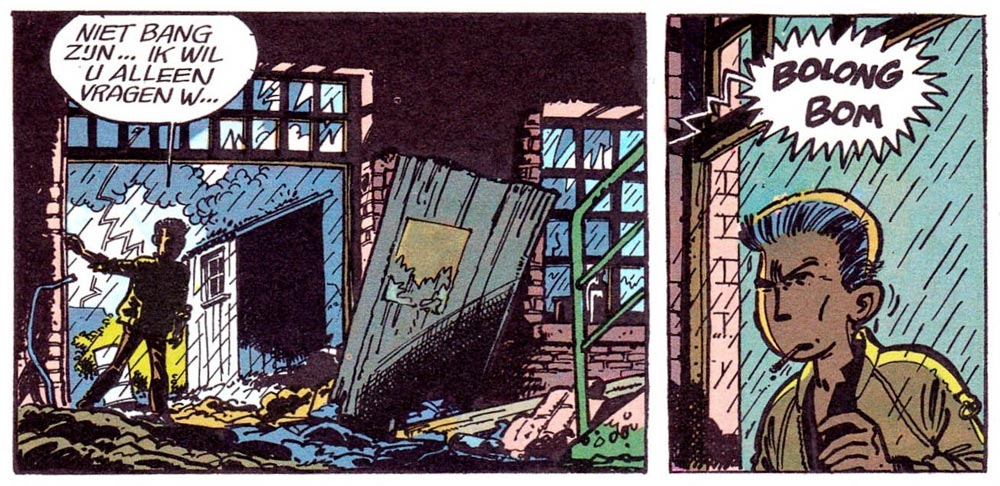 The graphical challenge of the sci-fi 'Natacha' stories inspired Jidéhem to revive his original character, 'Ginger'. Since 'Gil Jourdan' was no longer present in Spirou after the 1978 death of Maurice Tillieux, the time was right for a new hardboiled detective comic. For his revival of 'Ginger' (1979-1985), the artist applied a drawing style closer to Tillieux and his co-worker Gos, and threw his heroes into an adventure full of mysteries, explosions and science fiction. After a six-page short story in 1979, the first serial was published in two parts: 'Les Yeux de Feu' (1981) and 'L'Affaire Azinski' (1982), which were subsequently published in book format by Dupuis. Two half-length stories, 'Les Jeux sont Faits' (1984) and 'Les Mouches de Satan' (1985) were collected in a third album.