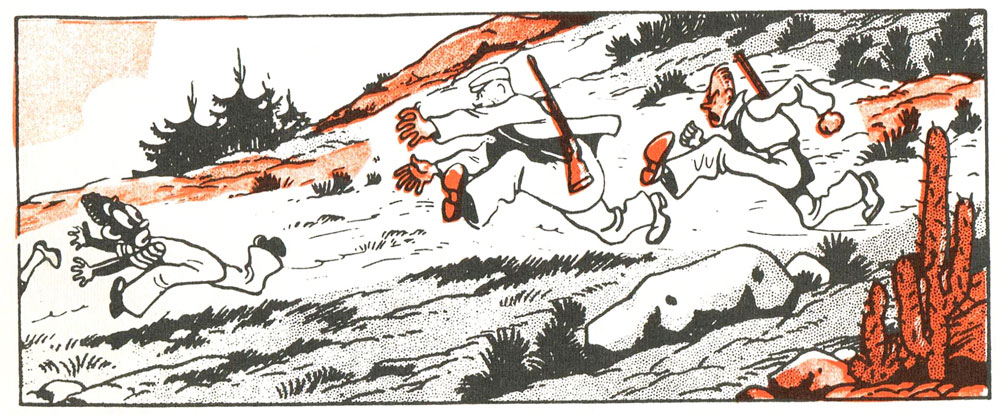 Inspired by his overseas sojourn, Mexico and the United States became regular settings in many of Jijé's later comics. With his photographic memory and assembled documentation, the artist was able to faithfully reproduce the locations he visited before. He kicked off with 'Blondin et Cirage au Mexique' (1951), a new story with his two black and white kid characters. It had been almost ten years since Jijé had last drawn the comic for Petits Belges, and since the conclusion of Victor Hubinon's sole 1947 story with the characters for Spirou, the series had not been continued. Inspired after their Mexican adventure, Jijé immediately continued the adventures of the two boys in the serial 'Le Nègre Blanc' ("The White Negro", 1951). For 'Kamiliola' (1952), Jijé reused the plot from his aborted second 'Trinet et Trinette' story, and in 'Silence! On Tourne' ("Silence! We're Filming", 1953), he spoofed the movie industry. One of the most notable installments was the final one, 'Blondin et Cirage Découvrent les Soucoupes Volantes' ("Blondin and Cirage Discover Flying Saucers", 1954-1955). Paying tribute to his pupil André Franquin, Jijé introduced an African Marsupilami in this story, who was far more lazy than his long-tailed Palombian family member from Franquin's 'Spirou' stories. In 1963, Blondin and Cirage returned only once more for a short Christmas story. Between 1952 and 1956, Dupuis released all five serials in book format, four of which were reprinted between 1978 and 1984 in the publisher's 'Péchés de Jeunesse' (“Sins of Youth”) collection.