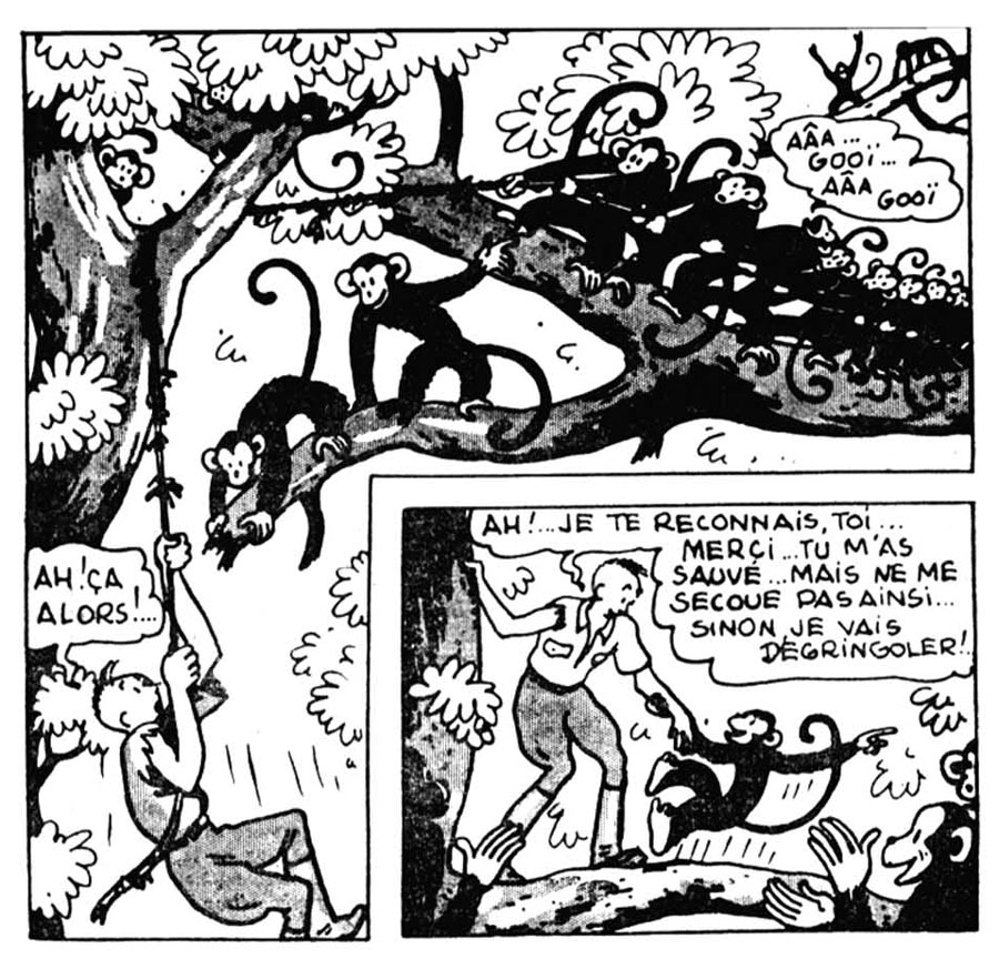 In addition to the magazines Le Croisé and Spirou, Jijé also began a collaboration with Petits Belges, a Catholic children's publication of the abbey of Averbode. On 16 July 1939, Jijé introduced the readers to 'Blondin et Cirage', the adventures of a white and a black boy. To modern standards, the depiction of the black Cirage - whose name translates as "shoe polish" - can be considered stereotypical and racially offensive. But at the time, true to the paternalistic nature of Catholic children's magazines, the friendship between the two boys represented the Christian ideal of charity and equality, as well as a reconciliation between black and white. Being just as clever and heroic as the white Blondin, Cirage was a groundbreaking character in Belgian comics. After Blackske in Pink's 'Suske en Blackske' (1932), he was the second black comic book character with a starring role, and the first who was more than just a racial caricature. It took until after World War II before black and white duos became more common. Blondin and Cirage seem a probable inspiration for Frans Piët's 'Sjors en Sjimmie', a popular Dutch comic series with a black and a white hero. In 1950, the Flemish newspaper comic 'Nero' by Marc Sleen introduced the character Petoetje, a Papua New Guinean boy who shares much of his looks with Cirage.