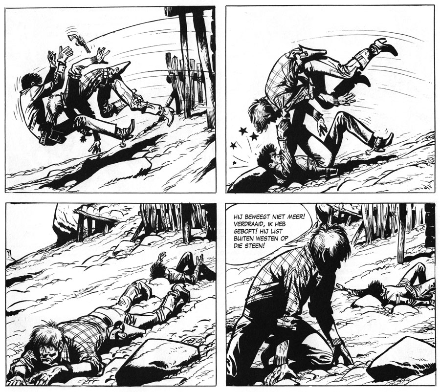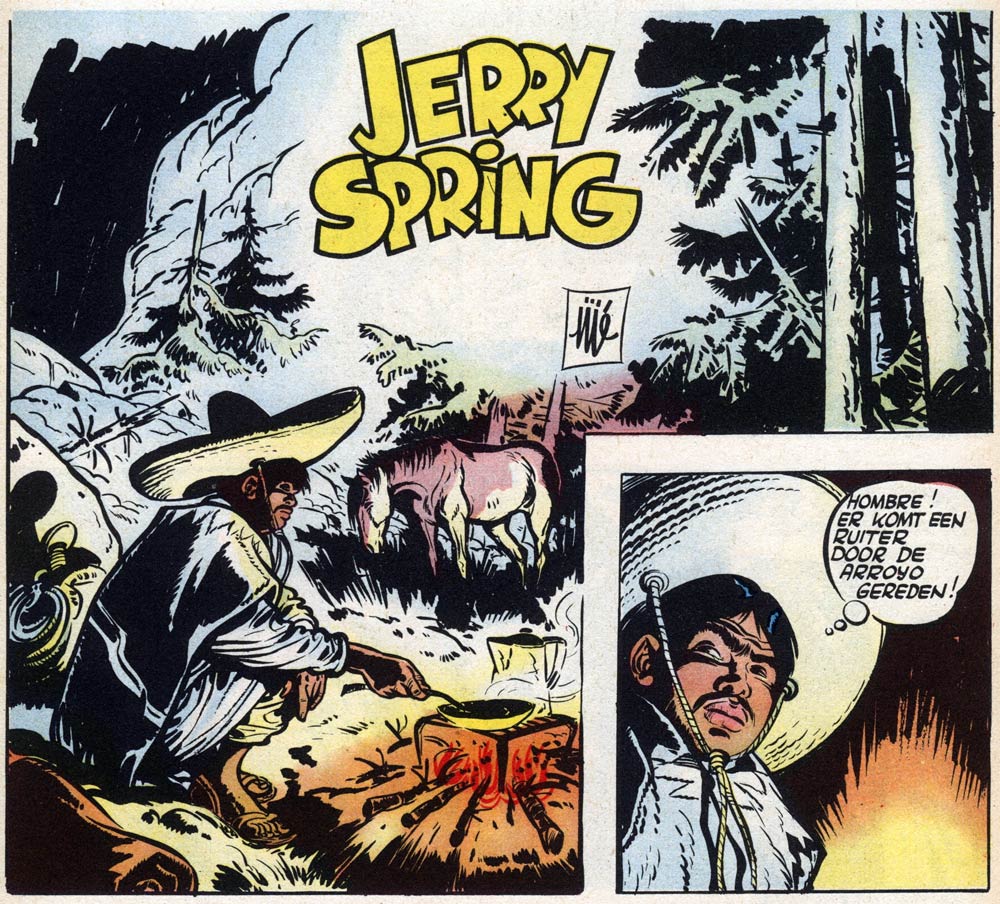 Also during the 1950s, Jijé launched what is perhaps his best-known series, the western 'Jerry Spring' (1954-1977). Jerry Spring is a brave and noble gunslinger whose father was brutally murdered by the Apache. Since then, Jerry and his trusty horse Ruby roam the Far West. During one of his adventures, he meets the Mexican Pancho who becomes his best friend and the series' comic relief. Together, they fight for justice and help the needy, including the Native American and Black population. The first episode, 'Golden Creek', started on 4 March 1954 in issue #829 of Spirou magazine. It served as a replacement for the imported 'Red Ryder' comic by Fred Harman and offered a more serious and dramatic counterweight to Spirou's humorous cowboy feature 'Lucky Luke', created by Morris. In the background art, the 'Jerry Spring' comics gave atmospheric impressions of the U.S. Southwest and Mexico, mostly lifted from the sketches and photographs Jijé made during his stay in these countries. Among his peers, Jijé is also widely praised for his depictions of horses. To give the graphics more space and impact, the early 'Jerry Spring' stories had three panel rows per page instead of the common four.