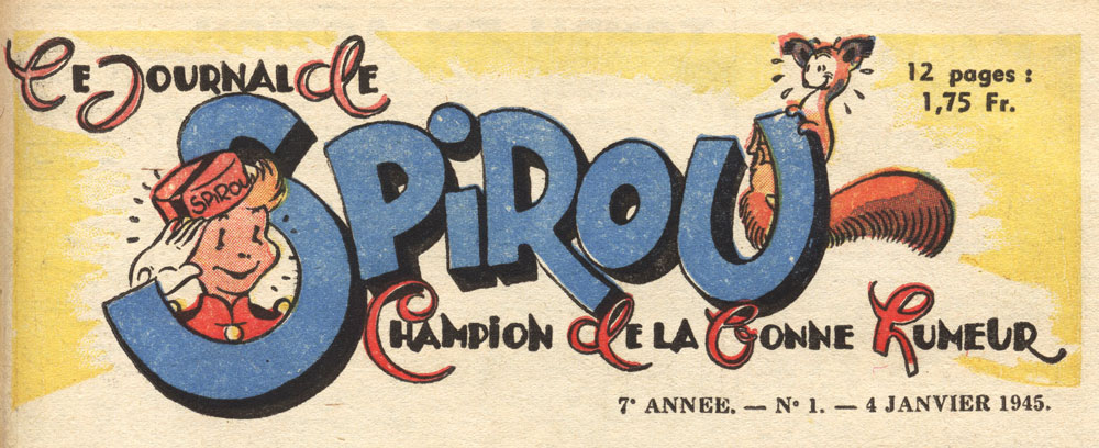Jijé designed a new header for Spirou magazine upon its reappearance, adding the subtitle "Champion de la Bonne Humeur" ("Champion of Good Mood").