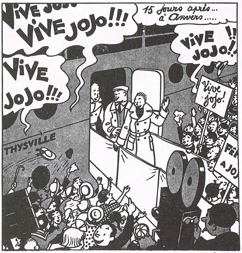 In the second half of the 1930s, comics became Joseph Gillain's main occupation. As adventure comics were still relatively new in Belgium, much of the early efforts were characterized by their naïve graphics and improvised good-versus-evil storylines. Gillain's early comics were no different, and appeared in several edifying Catholic children's magazines. The first was La Semaine du Croisé, a publication of the "Eucharistic Crusade'' movement. The editors asked Gillain to "make them a Tintin", so they could compete with the rival magazine Le Petit Vingtième, which ran the adventures of Hergé's famous reporter. Gillain's 'Le Dévouement de Jojo' commenced on 17 May 1936. As requested, the character had a strong resemblance to 'Tintin'. He is a young and heroic reporter, whose adventures take him all over the world. Graphically, he was basically the same character, only with a pointed nose. For a pen name, Joseph Gillain again used Hergé as an example, and phonetically combined his initials to spell "Jijé". When Hergé noticed the resemblances between Jojo and Tintin and complained about it, Jijé famously replied with a succession of three drawings that showed how Tintin morphed into Émile-Joseph Pinchon's 'Bécassine', proving Hergé himself was no stranger to borrowing from other artists. However, the Hergéan influences gradually disappeared from Jijé's artwork over the course of the second story, 'Les Nouvelles Aventures de Jojo'. By the time Jojo's adventures came to an end on 2 July 1939, Jijé had largely found his own style. The ‘Croisade des Enfants’ collected the adventures of Jojo in two books.