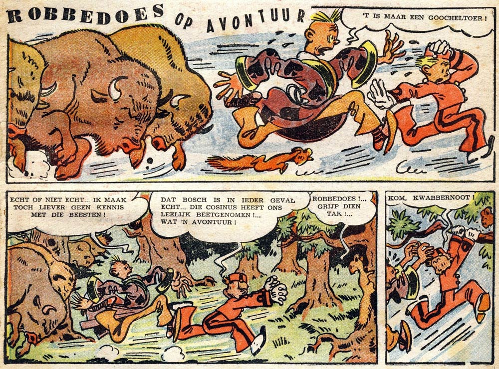 When the Nazis banned all imports of U.S. comic series, Jijé had to improvise alternate endings for the ongoing serials, for instance in May 1941 for Siegel & Shuster's 'Superman', and in November 1942 for Fred Harman's western comic 'Red Ryder'. A more disruptive matter was the absence of the mobilized Frenchman Rob-Vel and his wife Blanche Dumoulin, who provided the title comic, but were now out of reach. Between 7 November 1940 and 13 March 1941, Jijé filled in on 'Les Aventures de Spirou' for the first time, turning the spirited bellboy into a movie star and then sending him and his pet squirrel Spip on a North Pole adventure.