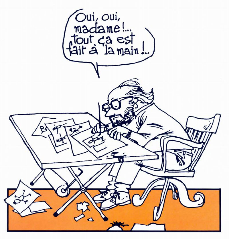 As Jean-Marie Charlier was notorious for always being late with his scripts, Jijé often had to wait until new 'Tanguy et Laverdure' stories arrived. During these interludes, he enjoyed himself with more caricatural and satirical work. In 1972 and 1973, he made some political cartoons and parodies about the lives of famous people for Pilote. With editor Pierre Bellemare and scriptwriters Jean-Paul Rouland and Claude Olivier, he created the humorous riddle comic 'Les Enquêtes du Commissaire Major' for the Lille-based regional newspaper La Voix du Nord (1971-1973). Also in a comical style, he produced a series of six caricatural stories with Jerry Spring's friend Pancho under the banner 'Que Barbaridad!' for the Spirou supplement Le Trombone Illustré (1977), edited by Yvan Delporte and André Franquin. Jijé additionally illustrated the English language guide 'Apprendre l'Anglais par la Bande Dessinée' (“Learning English through Comics”, Marabout, 1972) by Félix Packnadel, which was also translated into Dutch as 'Engels Leren Dankzij het Stripverhaal'. He also provided artwork for advertisements for Manpower, Solo, Kodak and Gilette.