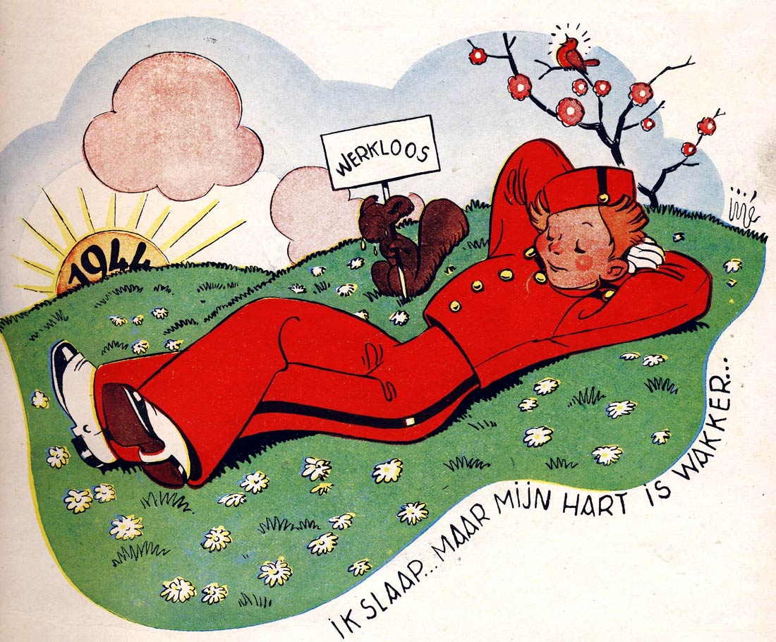 Dutch-language Spirou calendar 1944 during the publication ban ("I am asleep, but my heart is awake..." The sign says "Unemployed").