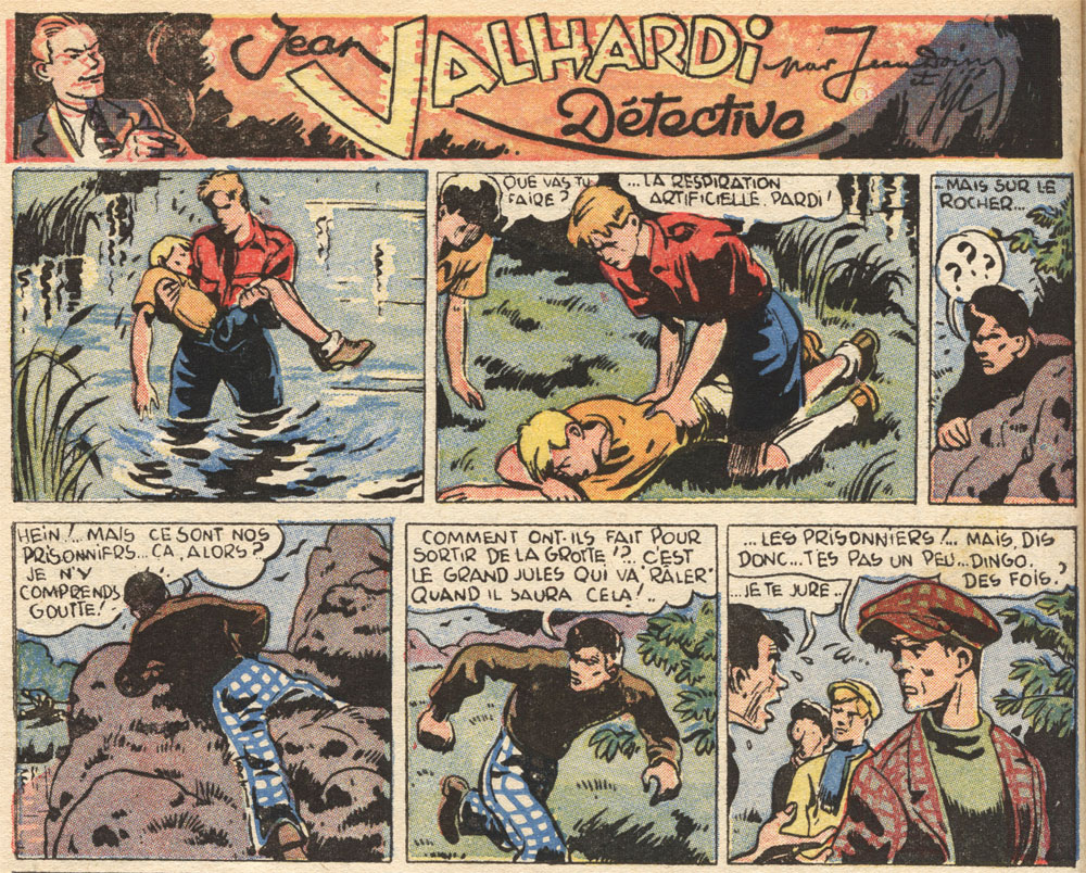 A still caricatural Valhardi saves Jacquot for the first time (Spirou, 13 November 1941).