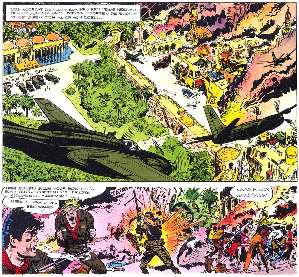 The comic ran in Pilote until 1971, and was then continued in the French edition of Tintin (1973) and in Super As (1979-1980). Commercially, the 'Tanguy & Laverdure' comic proved far more rewarding than his own series, but artistically, Jijé's heart lay with westerns. Although he was known for being a quick and qualified worker, the technical drawings of airplanes were a heavy burden for the generally more spontaneous draftsman. From 1967 until early 1971, assistance was found in Francis Jouet and Daniel Chauvin, who helped Jijé with the planes and the lettering. Cover illustrations were painted by Yves Thos.