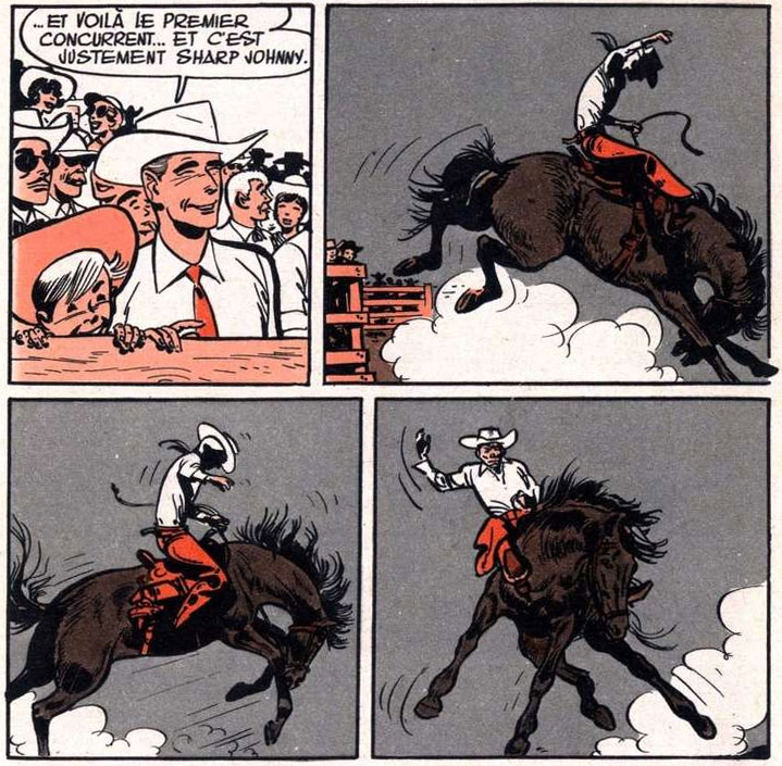 In order to spend his time on more artistically rewarding projects, Jijé "handed out" his regular series to the next generation. André Franquin received  'Spirou et Fantasio', Eddy Paape took over 'Jean Valhardi' and Victor Hubinon drew a new adventure with 'Blondin et Cirage', who now joined the cast of Spirou. By then, Morris had already created his humorous cowboy 'Lucky Luke', while Will took over 'Tif et Tondu' from Ferdinand Dineur. On two later occasions, Jijé returned to 'Spirou et Fantasio', creating the fill-in stories 'Comme une Mouche au Plafond' (1949) and 'Les Hommes Grenouilles' (1951). Collected in the album 'Les Chapeaux Noirs' (1952), they are the only Jijé stories included in the regular 'Spirou et Fantasio' book series.