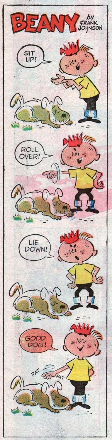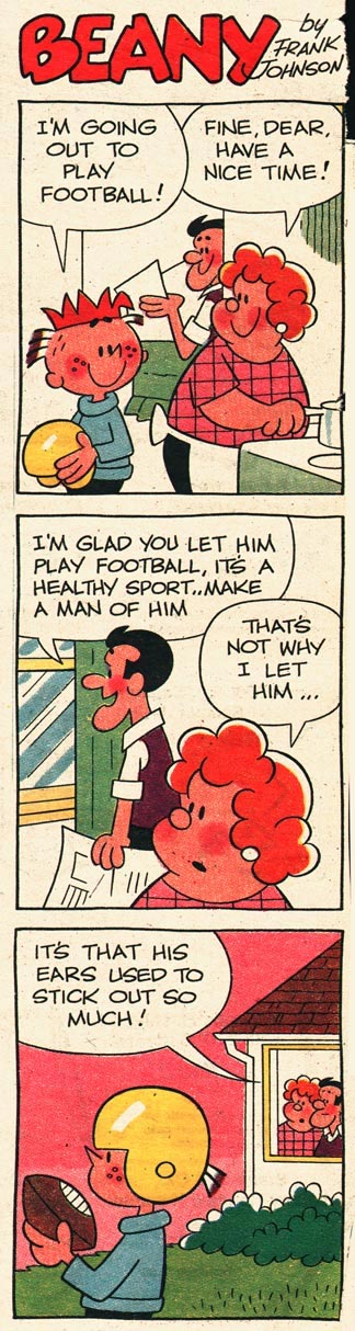 In 1963, Johnson created the newspaper gag comic 'Beany' (1963-1979), about a boy and his dog. It was published vertically in the Sunday editions of newspapers syndicated by the Chicago Tribune, though not every week. It usually alternated with Roy Fox's gag comic 'Tweety-Pie'. 'Beany' ran until 19 August 1979.