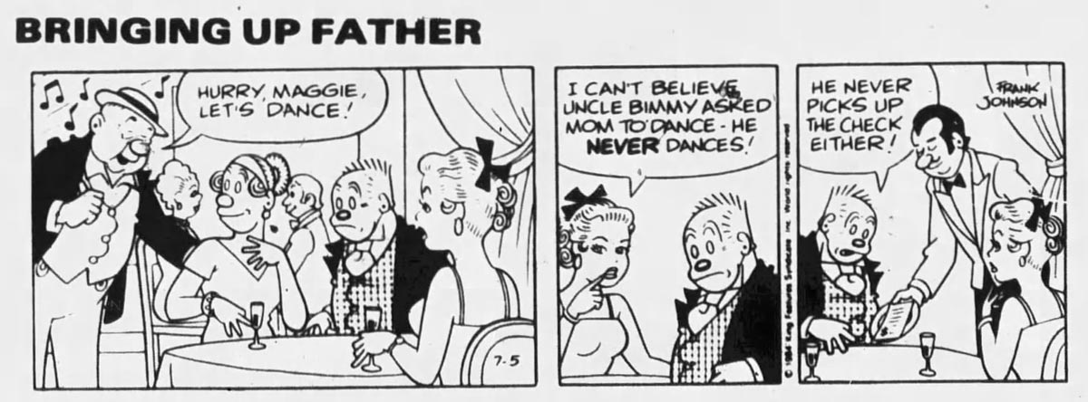 Between 19 February 1981 and 28 May 2000, Johnson succeeded Hal Campagna and Bill Cavanaugh as the artist and writer of 'Bringing Up Father', originally created by George McManus in 1913. He was the final artist to continue it until its eventual cancellation by King Features Syndicate. Mort Walker occasionally wrote gags for 'Bringing Up Father' during this era too.