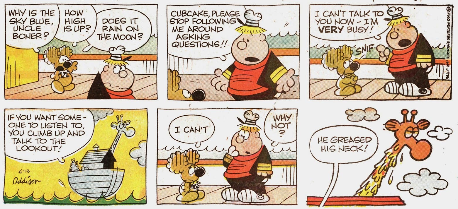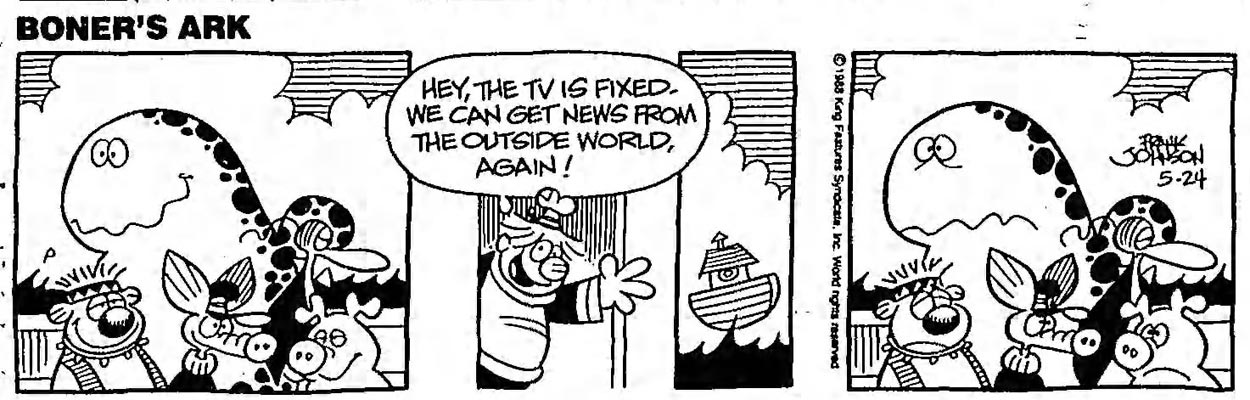 Walker initially drew the comic strip personally, albeit under the pseudonym Addison - which is his second surname. From 1971 to 2000, he passed the pencil to Johnson, while remaining on board of the ark as scriptwriter. Until 1982 Johnson was uncredited, but afterwards his name finally appeared next to Walker's in the comic strip's heading. Despite a long run and translations in Norwegian, Swedish (both under the title 'Arken'), Danish ('Olsen's Ark'), Finnish ('Masan Arkki'), Italian and Dutch ('De Ark van Zoo'), 'Boner's Ark' never enjoyed the same worldwide popularity as 'Beetle Bailey' or 'Hi and Lois'. Boner and his animal passengers eventually went ashore on 27 May 2000. Blackthorne Publishing had released a 'Boner's Ark' collection with Frank Johnson stories in 1986.