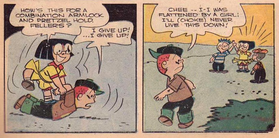 Frank Johnson was born in 1931 in Miami, Florida. After his military service, he started off working on various children's comic books for St. John Publishing, Fago Comics and most notably Charlton Comics in the period 1956-1960. Most dealt with peculiar kids who cause havoc wherever they go, such as Charltons' 'Rock and Rollo', 'Li'l Genius', 'Li'l' Tomboy' and 'Li'l Rascal Twins', St. Johns' 'Double Trouble' and Fago's 'Li'l Menace'. Other comic books featured funny animals (Charlton's 'Tom Cat') or a ghost kid (St. John's 'Li'l Ghost'). Johnson also drew for 'My Little Margie's Boyfriends', Charlton's comic book series based on the TV sitcom 'My Little Margie' (1952-1955).