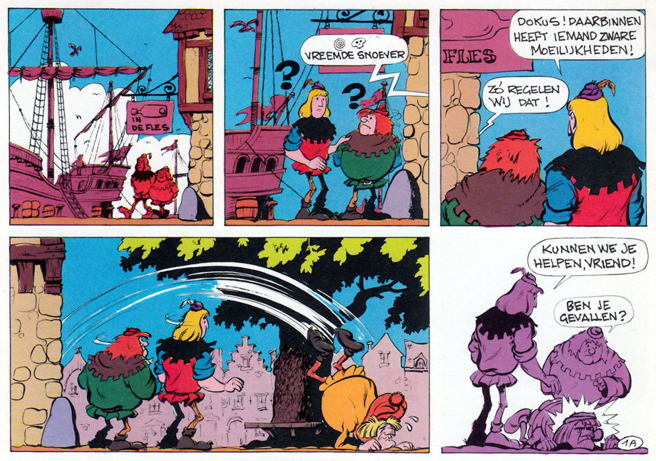 While Waterschoot and Roderyck made serious adaptations of the 'Jan Zonder Vrees' novels, the Dolphyn-Lagrillière version was more humorous and playful, presenting the main stars Jan Zonder Vrees and his good friend Dokus as a comical duo. The first two stories, 'De Gestolen Neus' (1970) and 'De Vliegende Brandstichters' (1971), were scripted by Ever Hulst (pen name of E. Verhulst). The third and final comic story, 'Gunnars Goudstuk' (1971), was written by Karel Verleyen - author of several original 'Jan Zonder Vrees' novels, but also a comic scriptwriter for Hurey, Jean-Pol, Rony Heirman and Jan Hoet. 'Gunnars Goudstuk' is by far the most outlandish story in the comic series, bringing the medieval Flemings all the way to pre-Columbian America, where they meet Native Americans.
