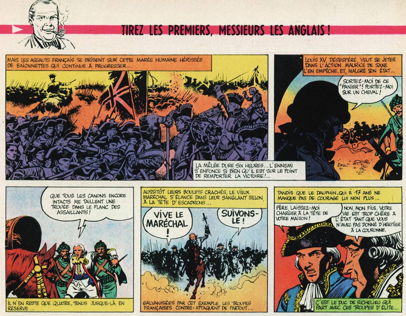 'Tirez Les Premiers, Messieurs Les Anglais', an 'Oncle Paul' story about the battle of Fontenoy, with art by Juan Manuel Cicuendez (Spirou #1630, 10 July 1969).