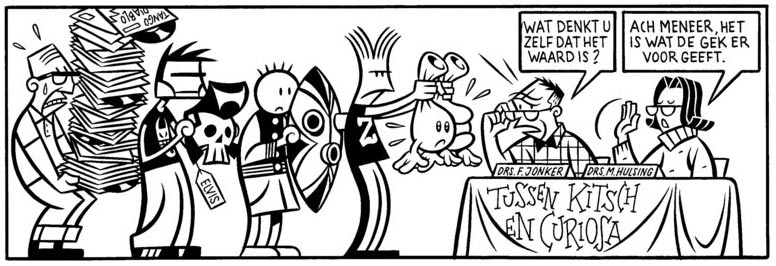 Editorial strip from Zone 5300, starring Pieter M. Dorrenboom, Luuk Bode, Michiel de Jong, Tonio van Vugt, Dinky & Donky, Frits Jonker and Milan Hulsing (from left to right).
