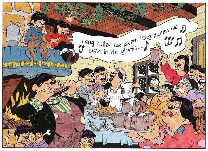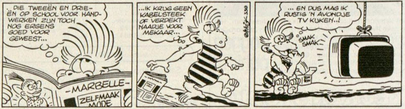 During the 1990s, De Jonge also tried his hand at new comic projects. For Panorama magazine, he worked with scriptwriter Toon van Driel on the weekly comic feature 'Piet P. & Arie O.' (1990-1991), starring the sleazy anthropomorphic monkeys Piet Patjakker and Arie Osseworst. Afterwards, he teamed up with his wife Marjanne van Nieuwpoort to create 'Bolleboom' (1991-1992), a gag strip starring a monkey family. The strip appeared in Studio, the magazine of broadcasting foundation KRO, and in several regional newspapers of the GPD group (for instance between 16 April 1991 and 30 November 1992 in Provinciale Zeeuwse Courant). In the mid-1990s, De Jonge and Van Nieuwpoort continued their collaboration at Okki magazine with a comic series starring the clown 'Zzappo!' and his funny animal friends. Joining the team was colorist Peter Wiegman.