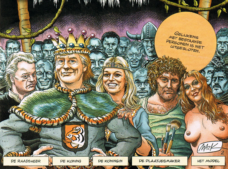 'De Papieren Tijger'. From left to right one can recognize far-right politician Geert Wilders as "the advisor", Dutch king Willem-Alexander and queen Maximá and Dutch novelist Jan Wolkers (of 'Turkish Delight' fame) and his wife Karina as "the artist" and "his model". The Viking in the back is H.G. Kresse's comic character 'Eric de Noorman'. Behind Karina one also recognizes Princess Diana.