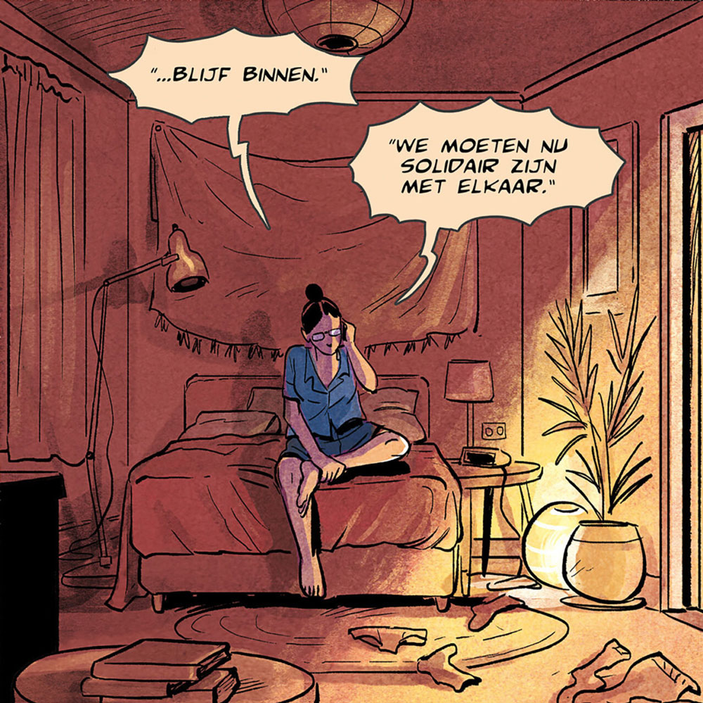 In 2020, she joined 75 Dutch & Flemish comic artists to make a graphic contribution to the free collective comic book 'Striphelden versus Corona' (Oogachtend, Uitgeverij L, 2020). The book was intended to support comics stores who had to close their doors for two months during the lockdown at the height of the COVID-19 virus pandemic. By request of Vrij Nederland, she subsequently made a comic strip about freedom, called 'Lockdown'. It was published on the magazine's website in August 2020, when the public debate about the social restrictions due to COVID-19 was raging. As the main character, she used a tour guide in the former Nazi concentration camp in Vught, a symbol of the lack of freedom. In the previous year, she had made a couple of illustrations for the Camp Vught National Memorial, which she called "one of the heaviest assignments of her career." Starting in February 2021, she supplied the print magazine with regular comic stories inspired by the issues of the day.