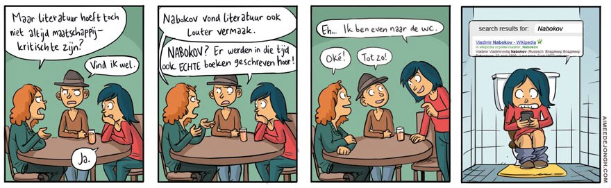 'Snippers'. Translation: - "But Literature doesn't always have to be critical of society?" - "I think it should." - "Yes." - "Nabokov also felt literature was just entertainment." - "Nabokov? In that time period people wrote real books too!" - "Eh... I have to go to the toilet for a moment." - "O.K.". - "See you." - "Search results for 'Nabokov.'".