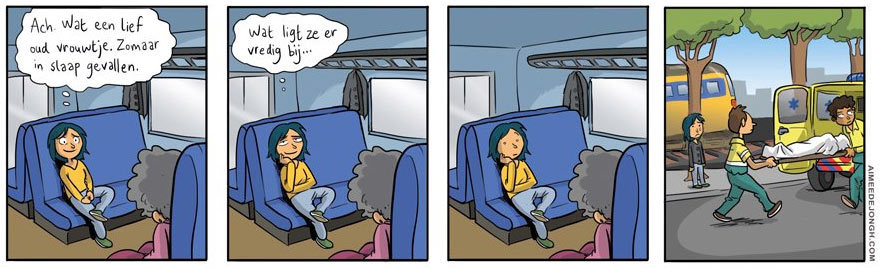 In January 2012, the publication of De Jongh's comic strip 'Snippers' started in the free public transport newspaper Metro. It was a semi-autobiographical daily comic strip about the everyday affairs of her comic persona and her roommate Stef. With recognizable subjects like public transport, social behavior, public services, everyday worries and irritations, 'Snippers' gives a funny look at everyone's daily life. However, in some episodes the author doesn't shy away from fantasy elements. The first book collection was published by Strip2000 in 2013, and the first French edition (called 'Coloc') appeared the following year through the Swiss publisher Paquet. Despite its large fanbase, De Jongh decided to quit her daily comic strip after five and a half years in June 2017 to focus on other creative projects. Ironically, she called it quits in the same month the paper decided to discontinue its other strip, 'Beestjes' by Schwantz.