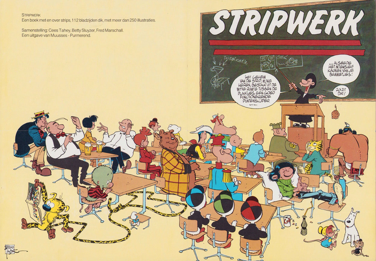 In 1983, Julsing illustrated the front and back cover of the educational book, 'Stripwerk' (1983). Written by Fred Marschall, Betty Sluyzer and Cees Tahey it was intended to be used in schools for thematic projects about comics. On the cover Julsing portrayed several famous comic characters together in class. On the left side of the page one recognizes Al Capp's Li'l Abner, Marc Sleen's Nero and Willy Vandersteen's Lambik bragging with two glasses of beer nearby, Peyo's Johan, Daan Jippes' Bernard Voorzichtig and Mary Tourtel's Rupert Bear. In the lower half of that same page André Franquin's Marsupilami holds the book 'Stripwerk', while behind him we recognize Walt Kelly's Pogo, Peyo's Smurf, Franquin's Spirou and Marten Toonder's Olivier B. Bommel. On the right side of the page we spot Morris' Lucky Luke, Albert Uderzo's Obélix, Peter de Smet's Generaal, Carl Barks' Huey, Dewey and Louie, Charles M. Schulz' Charlie Brown, Hergé 's Tintin, Mort Walker's Sergeant Snorkel, Robert Crumb's Fritz the Cat, Uderzo's Oumpa-Pah, Franquin's Gaston Lagaffe and in the lower right corner Raymond Macherot's Sybilline, Hergé's Snowy and Ol' Mouse from Walt Kelly's 'Pogo'.