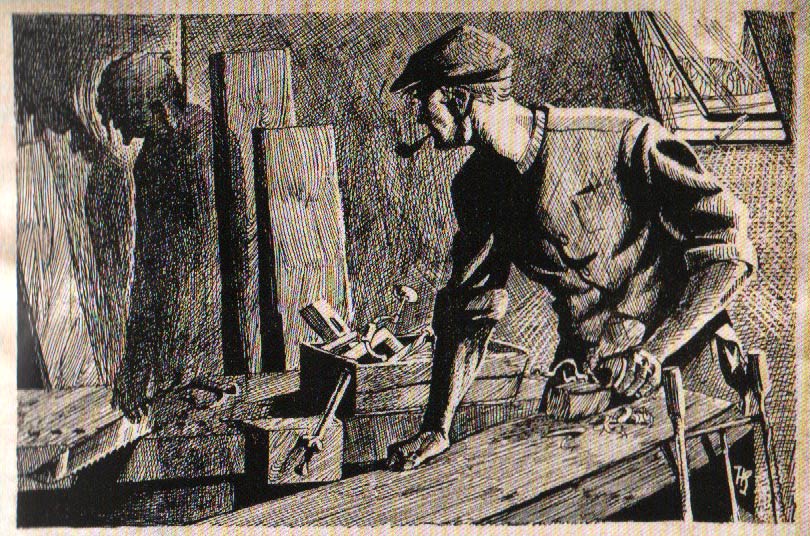 During World War II, both Kabos, Toonder and other co-workers got involved with Dick van Veen and Jo Pellicaan's illegal printing company D.A.V.I.D. and its magazine Metro. They operated from a so-called "second division" of the Toonder Studios in the Amsterdam Spuistraat. D.A.V.I.D. printed illegal papers like Vrij Nederland, Het Parool and Trouw, but also booklets for the publishing company De Bezige Bij. Kabos designed the printer's logo and provided illustrations for several of their publications, often under the pseudonym Karel Woud. Most notable was Jan Gerhard Toonder's booklet 'Keukenkrabbels' (1945), followed after the war by 'Geef Ons Heden Ons Dagelijks Brood' (De Suijckermoolen, 1946). Both books gave a visual and written expression of the despair and anger during the war years, particularly the Hunger Winter (late 1944 - early 1945), when the northern half of The Netherlands was still under Nazi occupation and endured severe famine.