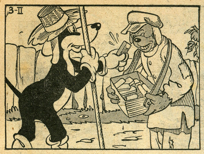 Kabos' signature series, 'Tekko Taks' (1946-1952), debuted in the newspaper De Nieuwe Nederlander, where the first three stories ran until 1947. Afterwards, the comic ran for another 28 stories in Trouw. The stories revolve around a black anthropomorphic dachshund, Tekko Taks. The character is quite homebound and loves gardening. Only out of necessity do plots force him to go on adventure to exotic locations set in a funny animal world. Like many Dutch comic series during that period, the series was a text comic, with the narration and dialogues written underneath the images. Kabos' co-writer was James Ringrose, who also inked the drawings. Because they were so preoccupied with Toonder's animation projects during the day, both men mostly worked on 'Tekko Taks' during the evenings.