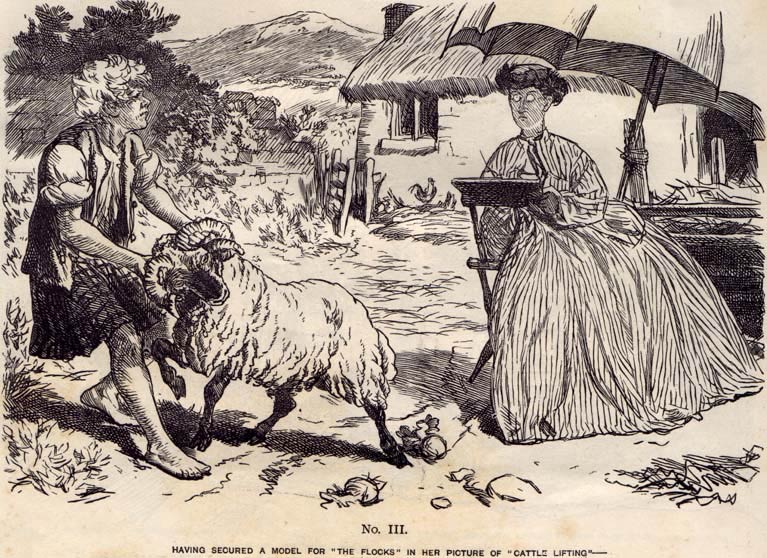 In 1866 Keene drew the text comic 'The Adventures of Miss Lavinia Brounjones'. It tells the story of a woman who plans to go out sketching in the Highlands. As she tries to draw some rustic scenes, she has some encounters with unpredictable sheep and a stereotypical Scotsman. The humorous tale is told in pictures, with dry, witty understatements written underneath the images. Historically, this one-shot comic is important for being the very first known comic strip to star a female character. It would take nearly half a century before other comics starring women as recurring characters first saw print. Gene Carr's 'Lady Bountiful' (1901) was the first balloon comic and actual comic series to star a female character. Grace Drayton's 'Toddles' (1903-1933, later renamed 'Dolly Dimples') is the first female character drawn by a woman cartoonist. Other notable pioneer comics about women were Winsor McCay's 'Hungry Henrietta' (1905), Émile-Joseph Pinchon's 'Bécassine' (1905), Grif's 'It's Only Ethelinda' (1908-1910)' and Jo Valle and André Vallet's 'L'Espiègle Lili' (1909-1998).