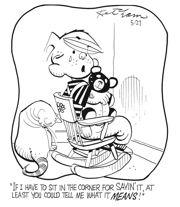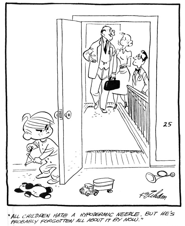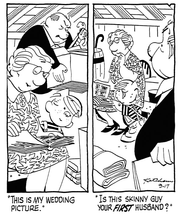 After the war, the young Ketcham family first settled in Westport, Connecticut and eventually in Carmel, California. Ketcham spent the first post-war years doing more magazine cartoons and commercial art assignments. He gradually improved his craft, taking advice from befriended cartoonists like Noel Sickles and Perry Barlow. At the time, Ketcham also greatly admired the New Yorker cartoonists Peter Arno, George Price, Whitney Darrow Jr., and Gluyas Williams.