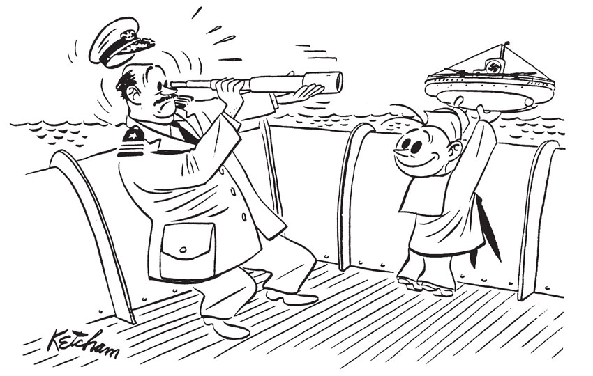 His 9 to 5 daytime job for the War Bond Allotment magazines offered Ketcham enough time to do additional cartooning in the evenings. By 1944, he regularly submitted gag cartoons to magazines like Collier's, The Saturday Evening Post, True and Liberty. He also delved into commercial art, creating Sylvester, the mascot for the National Retail Lumber Dealers Association. One of Ketcham's most notable wartime creations was 'Half Hitch' (1943-1945), a small sailor on a battleship who appeared in weekly pantomime single-panel cartoons on the back pages of the Saturday Evening Post. Ketcham revived the character during the 1970s in another comic strip feature.