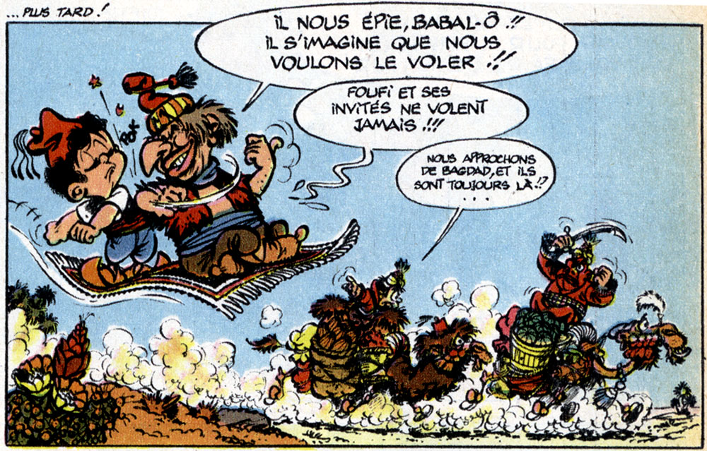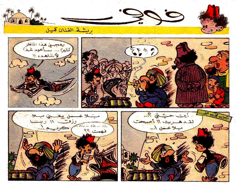 Camille, A.K.A. Kiko, stayed in Canada for a short period in 1962-1963 and then settled in Belgium, where he worked in André Franquin's studio in the Avenue du Brésil in Brussels for a while. It was during this period that he developed the little Persian boy 'Foufi' with his flying carpet for an Arab edition of the Superman comic published in Beirut, Lebanon. Several gags of Kiko's weekly Lebanese production were written by Franquin. The character appeared in 1964, in the first 35 issues of the magazine.