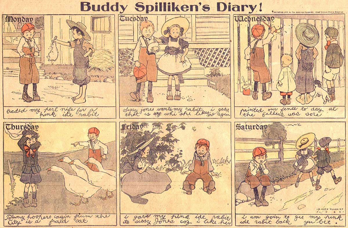 Between 18 October and 29 November 1908, William Randolph Hearst's American-Journal Examiner syndicated Kilvert's short-lived Sunday comic 'Buddy Spilliken's Diary', starring the everyday antics of a countryside kid. Each panel focuses on a different day of the week, recounting what Buddy did that day. The narration under the panels is written in deliberately clumsy handwriting, with ink spots, misspellings, erased words and "dancing letters", to evoke a child's handwriting. Remarkably enough, the Hearst organization didn't run the feature in its main New York American's Sunday comics section, but only made it available to other papers as a replacement. A similar comic running in The Netherlands a decade later was the long-running newspaper feature 'Uit het Kladschrift van Jantje' (1916-1936) by Felix Hess, and, more than half a century later, Jack Mendelsohn's 'Jacky's Diary' (1959-1962). Both went a step further and combined deliberate child-like writing with drawings that look like an infant made them.