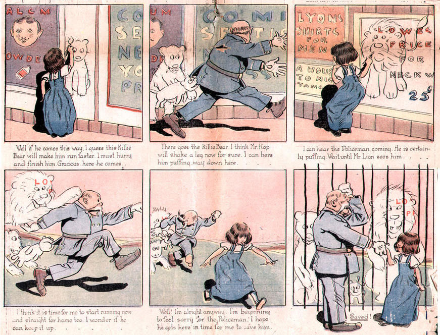 This lack of interest might explain why Kilvert's next strip ran in a lesser-known newspaper, the New York Press. Between 29 November 1914 and 16 May 1915, this paper ran his 'Dorothy And The Killies' Sunday strip, about a girl who can make her drawings come to life. But instead of creating sweet animals and fairy tale creatures, Dorothy draws bloodthirsty homicidal animals, which she calls "Killies", and sends them after whoever bothers her. The comic may have been inspired by another newspaper comic, Ed Payne's 'Billy the Boy Artist' (1899-1955), in which the titular boy character paints realistic looking images that constantly fool his environment. And more than a half century later, British comic artist Peter Maddocks also created a comic strip about a girl whose crayons have magic abilities: 'Penny Crayon' (1976), later adapted into an animated TV show.