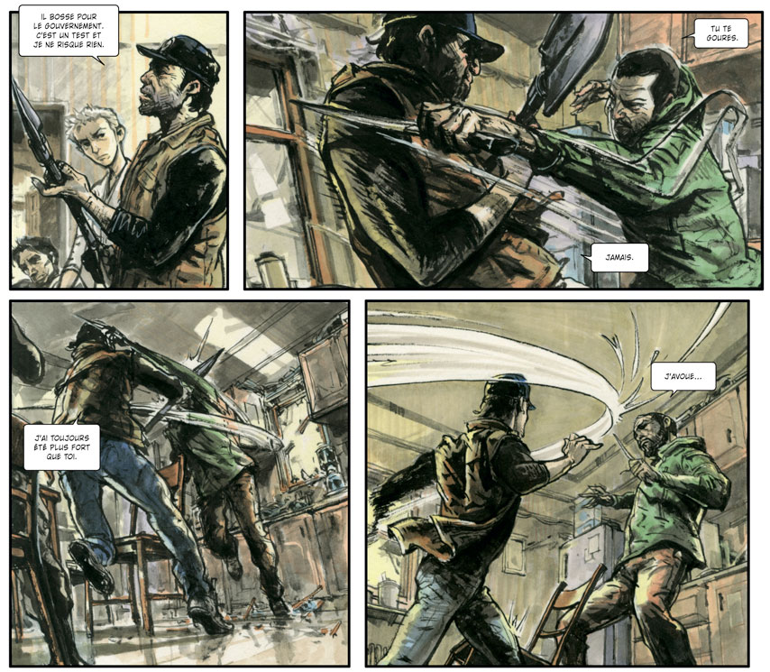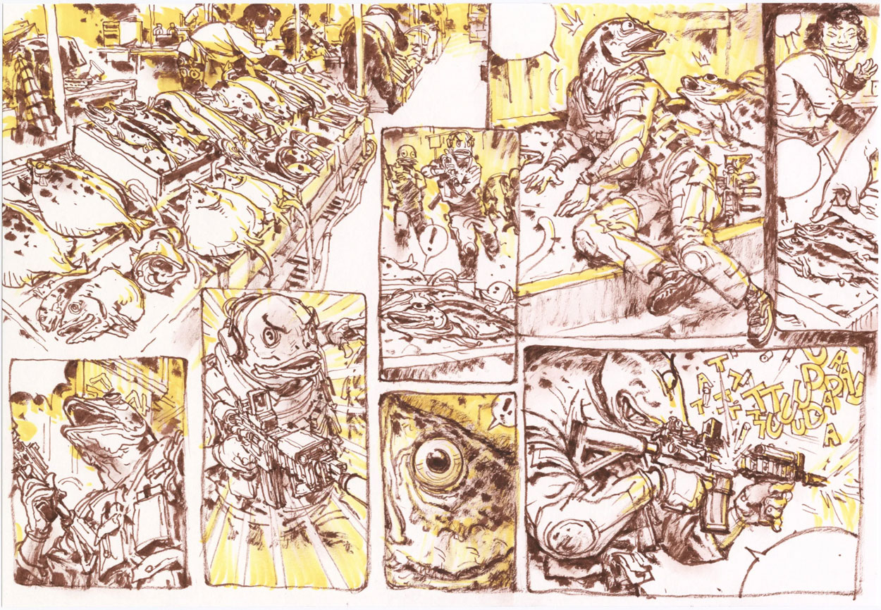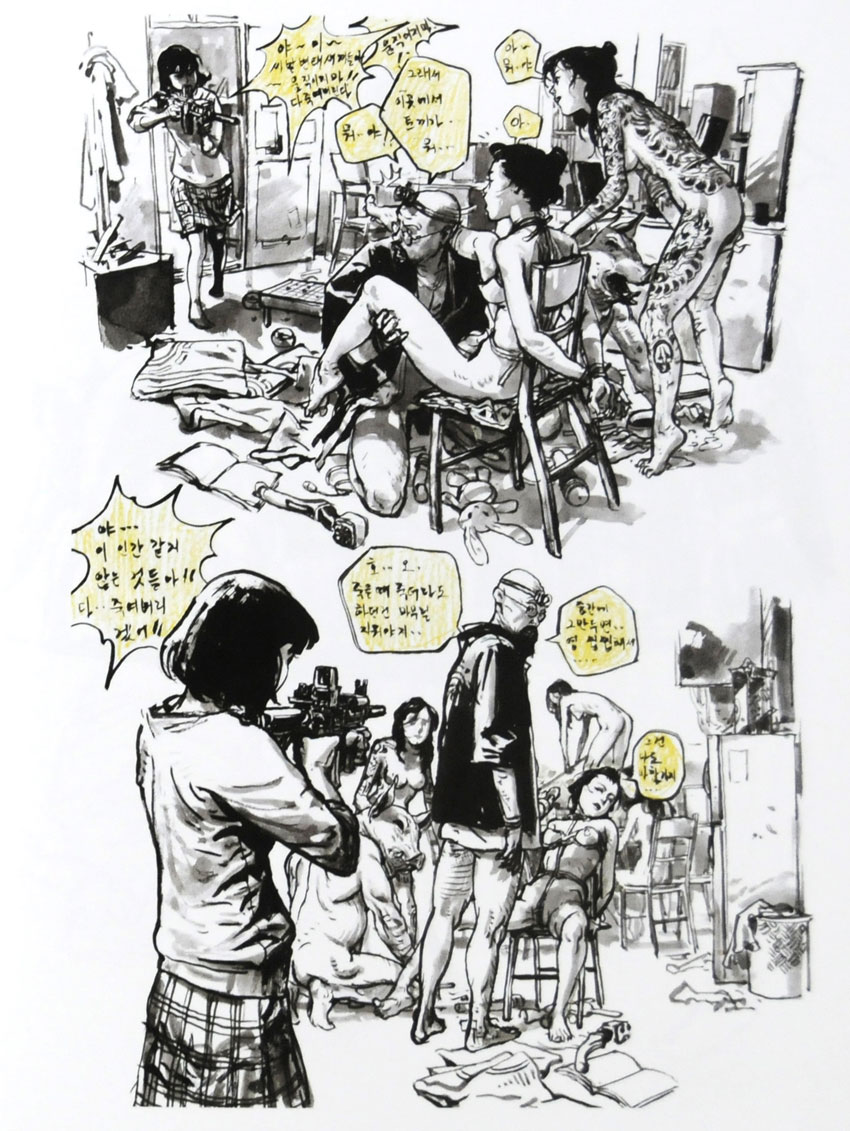 In 2009, Jung-gi was contacted by Han Sang-jeong, a professor at Sangji University. She told him she had met French comic writer Jean-David Morvan at the Comic Festival of Angoulême, France, who was very interested in his drawings. Kim Jung-gi and Morvan met twice, in the Korean cities Insadong (2010) and Hongdae (2012), and decided to work together on a graphic novel. Morvan sent his scripts to professor Han, who translated them from French to Korean. Unlike South Korean comic writers, Morvan's instructions were far more detailed, making it easier for Kim Jung-gi to translate the writer's ideas into drawings. Their series 'SpyGames' (Glénat, 2014) follows Chinese police commissioner Ka Lei Ng, who investigates a series of unsolved murders in Hong Kong. He discovers that these crimes are part of an international contest between the intelligence units of eight countries. This depraved version of the Olympic Games is a true survival of the fittest. Besides its French publication at Éditions Glénat, 'SpyGames' was also released in Chinese.