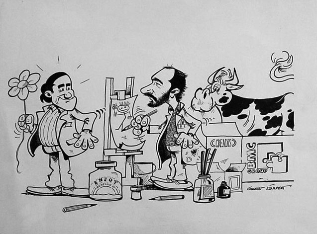 Born in Leuven, Geert Kinnaert grew up as an avid doodler. In issue #2125 (4 January 1979) of the comic magazine Robbedoes (the Dutch-language version of Spirou), one of his comics was published in the amateur section 'Plant 'n Knol'. Kinnaert received his graphic education at the Sint-Lukas School of Arts in Brussels, and eventually ran his own advertising firm. In the 1980s, he was also active as a local radio host at Radio Scorpio in Leuven. Between 1982 and 1996, he was involved with Radio Sinjaal, co-founded by him and his good friend Jan Dewijngaert (who later became a journalist for the commercial TV network VTM). The duo hosted the children's radio show 'De Rekel en de Mier' and the talkshow 'De Tokshow'. Together with Daniel De Laet, Kinnaert appeared as the fictional hosts De Haes & Van Mol in the satirical radio show 'Krikkedol' (1984). Although Radio Sinjaal went off the air in 1996, it returned on 4 January 2019 under a slightly different name, "Radio Singjaal", but with Kinnaert present again.