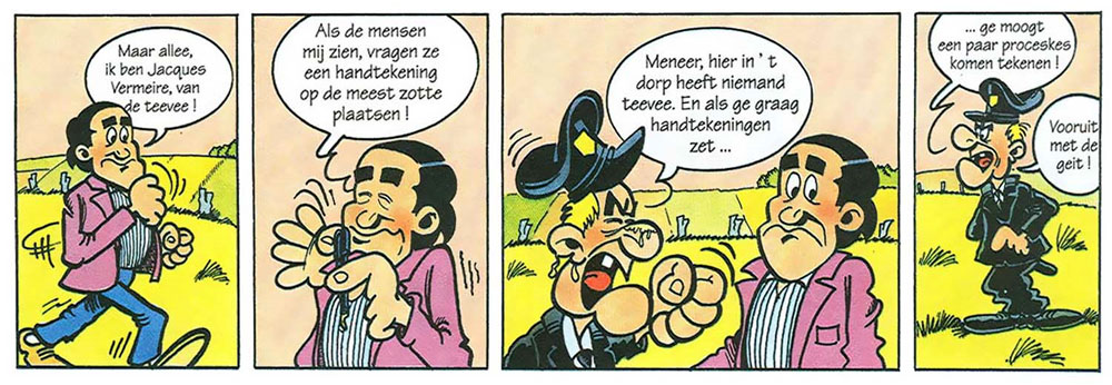 Geert Kinnaert's comic series wasn't Jacques Vermeire's only entry in the comic world. He appeared in the 50th 'Urbanus' story 'De Hete Urbanus' (1995) by Willy Linthout and Urbanus, presented in the style of a photo comic, with Vermeire playing himself as a "celebrity guest". When in 1997 Hec Leemans launched a celebrity comic based on 'F.C. De Kampioenen', Vermeire's role was also turned into a comic character. However, the comedian left the sitcom soon after to join the commercial TV channel VTM. Nevertheless, Leemans kept giving Vermeire's character a recurring role in the comic series.