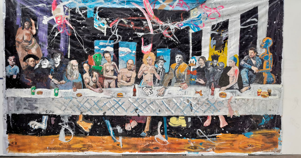 The most frequently recurring characters in Peter Klashorst's work came from the world of comics and cartoons: Hanna-Barbera's Fred Flintstone, E.C. Segar's Wimpy, Walt Disney's Mickey Mouse, Donald Duck, Uncle Scrooge, Goofy and Hergé's Tintin. Many of these characters were degraded by being shown in pornographic poses, such as a porn actress giving three ducks fellatio (presumably adult versions of Huey, Dewey and Louie) in a pun-based work titled 'Suck My Duck'. In 2015, Klashorst painted a parody of Leonardo Da Vinci's 'Last Supper', depicting behind the table himself and several of his graphic heroes, including Rembrandt, Robert Crumb, Donald Duck, Jean-Michel Basquiat, Pablo Picasso and Caravaggio. In 2013, he also repainted Roy Lichtenstein's 'M-Maybe', which in itself was based on a comic book panel by Tony Abruzzo.