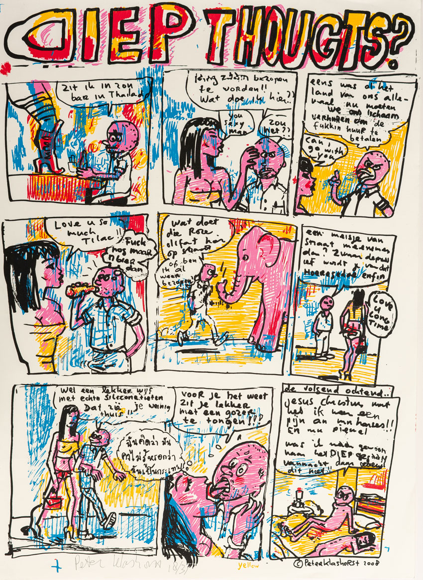 While Klashorst often used comic characters in his art, or reimagined comic book covers, he only made actual comics on rare occasions. In 2008, he drew 'Diep Thougts' (deliberately misspelled), a gag comic in which he walks around in Bangkok, resisting the temptation of going home with a prostitute, but eventually succumbing, to regret it afterwards. When the Amsterdam comic store Lambiek celebrated its 50th anniversary in 2018, Klashorst made another comic to celebrate the event. It was printed in the '50 Jaar Lambiek' (2018) anniversary book and featured Willy Vandersteen's Lambik claiming that "despite being 50", he wants to get laid. He then decides to use money to go to the red light district, making the money stashed away in his pants look like he has a huge penis. His sidekick Jerom, who apparently is well-endowed, wonders why Lambik "with his tiny dick" manages to get so many chicks? Even when ill later in life, Klashorst kept making comics. From his hospital bed, he drew the gag comic 'Pattaya Porn' in his sketchbook, depicting himself swimming in a river, while a dog pees on his clothes and a woman relieves herself in the stream. Disgusted, he eventually goes out to have sex with an Asian woman.