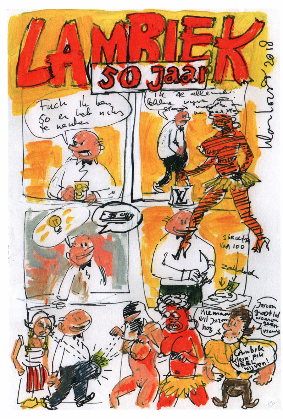 Peter Klashorst's contribution to the '50 Years Lambiek' book (2018), featuring Willy Vandersteen's Lambik and Jerom.
