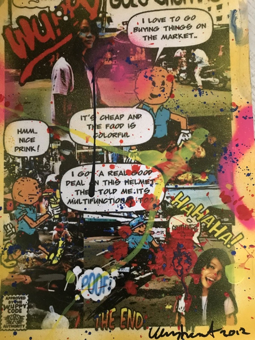 Klashorst's 2016 book 'Painters Tales' was made in the style of a cheap comic book, with Tintin in tropical helmet painting a nude model, while having an erection. Another mock comic book was Wuppy Comix, in which a Tintin-like character walks the Bangkok market, against several photographs of local streets, while a parody of the Comics Code approval sign appears in the top left corner. Klashorst also spoofed famous Tintin covers, like 'Tintin in Africa', where the quiffed reporter gives a black African a blowjob. Klashorst also ridiculed the 'Tintin' sex parodies 'Tintin in Switzerland' by Efdé and 'Tintin in Thailand' by Baudouin de Duve with the work 'Kluifje in Thailand'. The cover is an altered version of 'Tintin in Switzerland', only with Klashorst's face pasted on Tintin's.