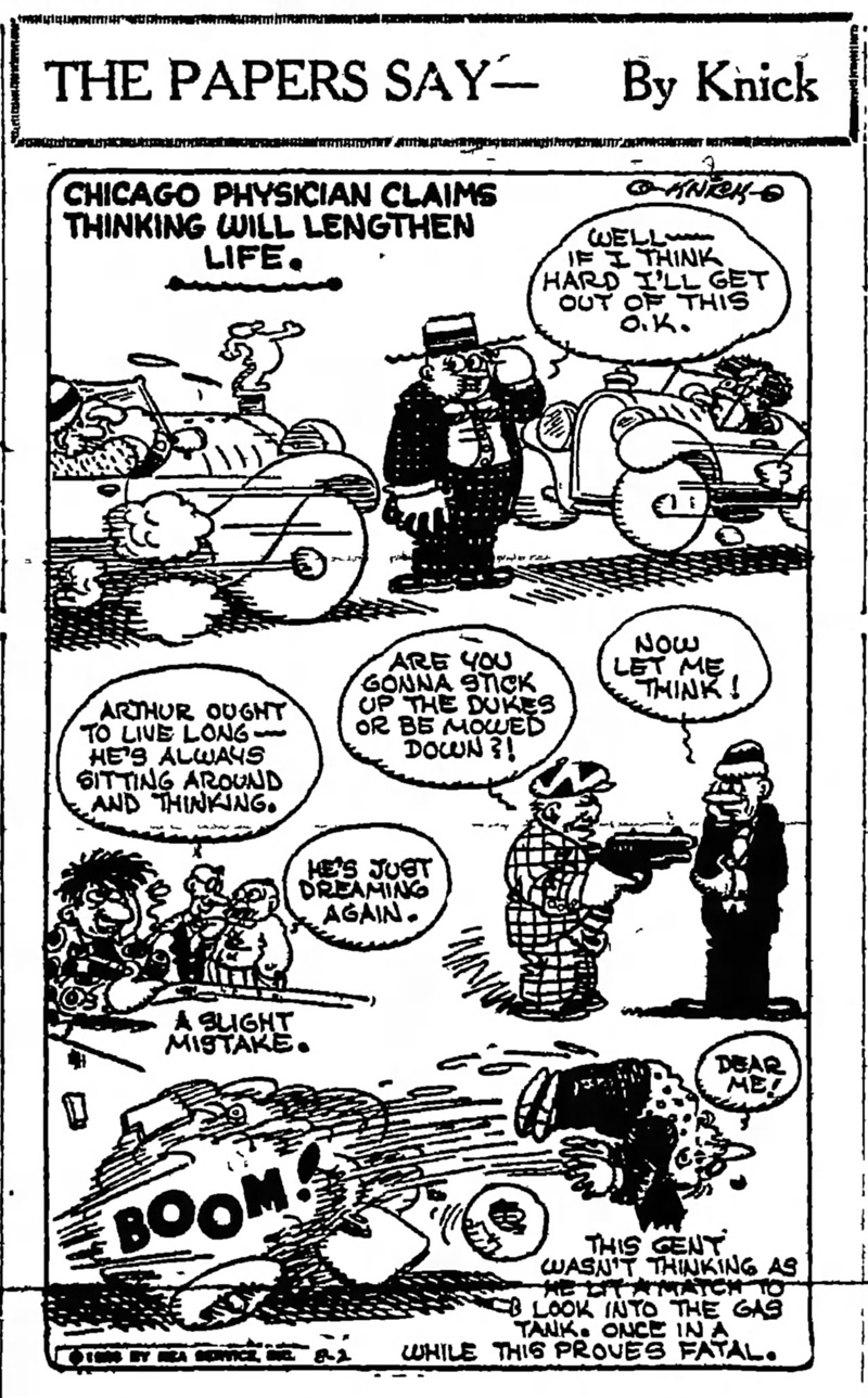 As a NEA staff artist, "Knick" made illustrations for feature stories on the news and sports pages, but also worked on a host of cartoon panels and comic strips. One of his early jobs was replacing Roy Grove on 'Bugs', a weekly gag strip for newspapers' radio pages. Like his predecessor, Knick managed to come up with a weekly gag variation about building and tuning radios between November 1925 and April 1926. The feature lasted until September 1927, subsequently drawn by Charles D. Small, George Swanson, Sefcik and Don Wootton. Knick moved on to 'Little Joe Says', a one-panel cartoon featuring a cross between a kid and a middle-aged man, accompanied by a wisecrack caption. He replaced Lawrence Redner in 1926, and continued it until the end of its run in June 1930. In his own feature 'The Papers Say', Knickerbocker satirically spoofed a newspaper headline in a couple of cartoons. It ran between 21 April 1926 and 13 January 1927.