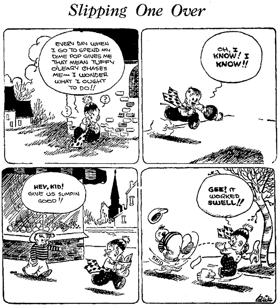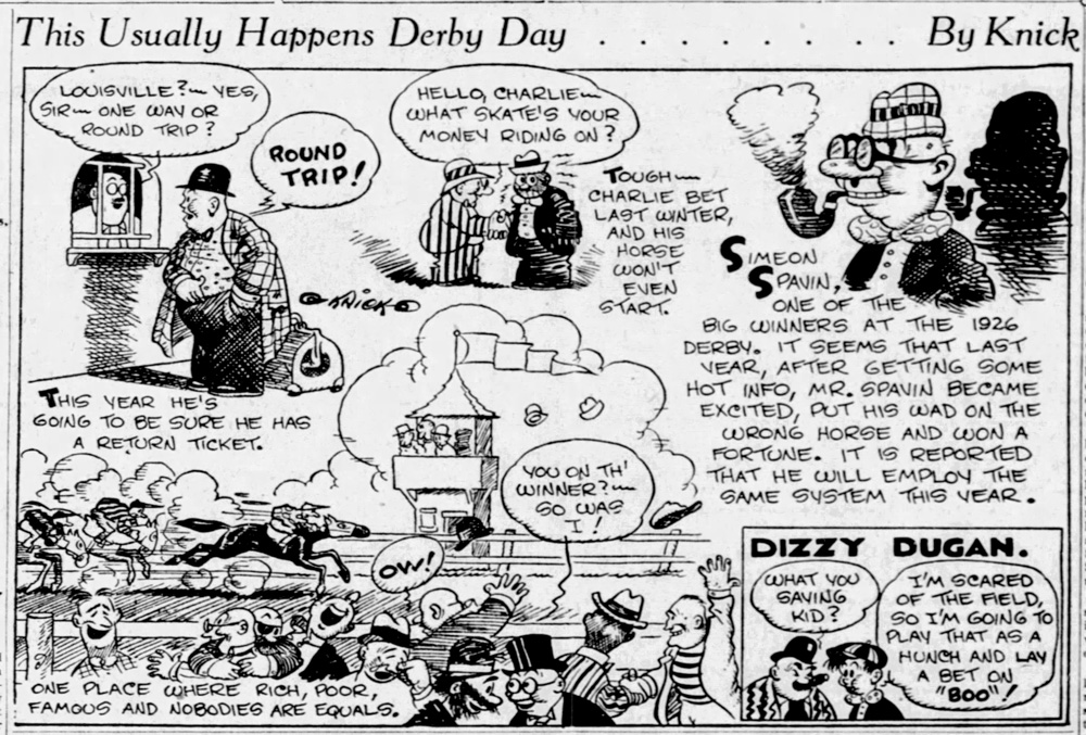 Knick was otherwise known by many newspaper readers for his daily sports cartoons. As a sub-feature, he created a character called 'Dizzy Dugan', who commented on sports events in a corner of the main panel. Dizzy also appeared under the title 'J. Disraeli (Dizzy) Dugan' as a topper to Charles D. Small's Sunday comic with 'Salesman Sam' between 9 October 1927 and 23 March 1930.
