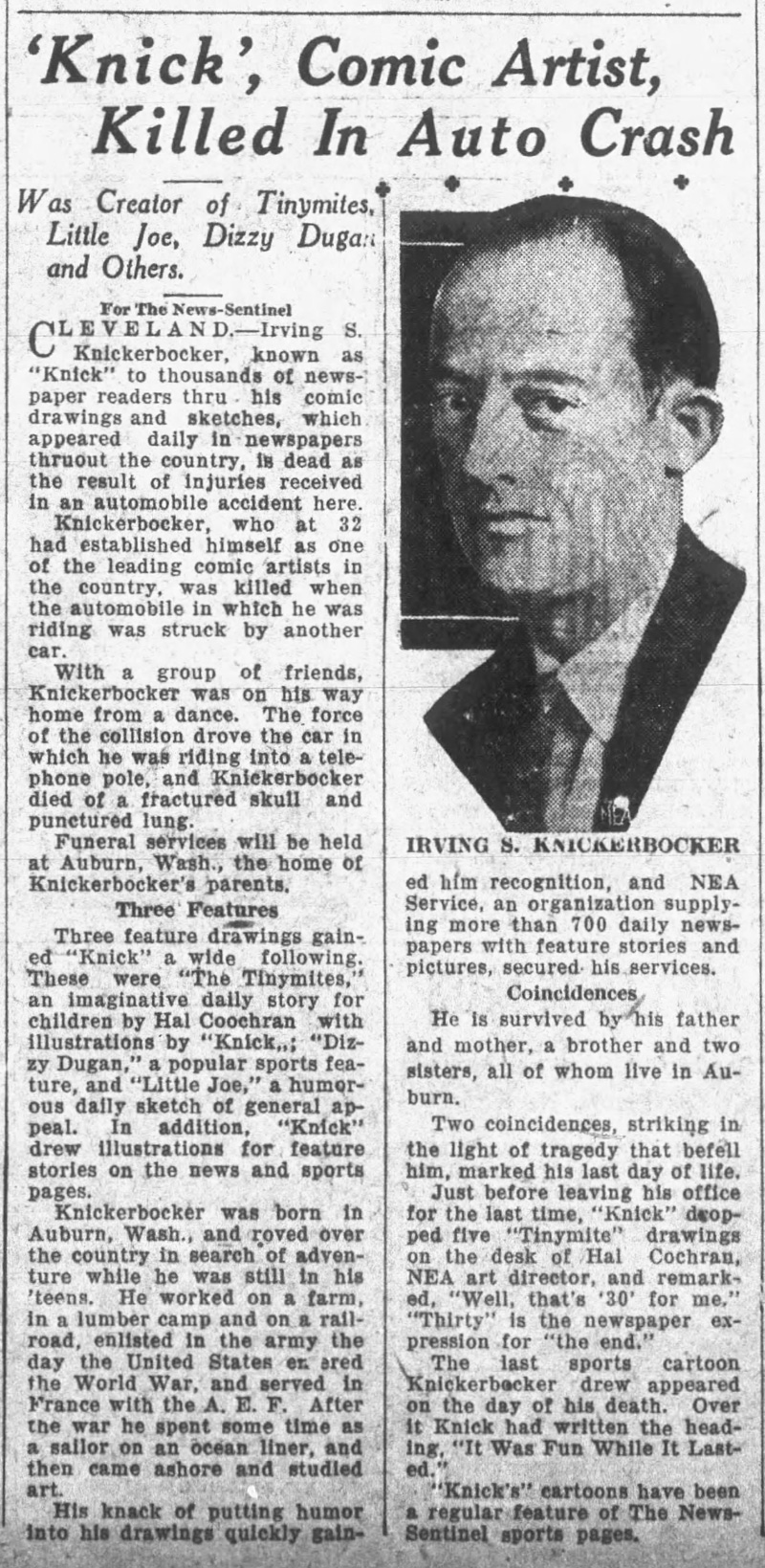 Irving Knickerbocker's life and career came to an early end on 26 January 1930, when he succumbed to injuries sustained in a car accident. He was only 32 years old. The cartoonist had just delivered artwork for five new episodes of 'The Tinymites', and his ongoing features 'Dizzy Dugan', 'Little Joe Says' and 'Mac' had enough stock supply for the next couple of months. His last sports cartoon appeared on the day of his death.